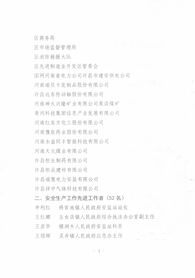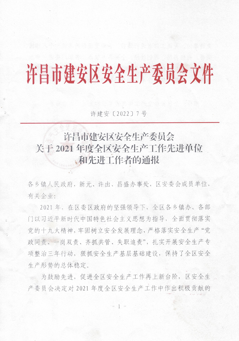 2021年,我公司以習(xí)近平新時(shí)代中國特色社會(huì)主義思想為指導(dǎo),全面貫徹落實(shí)黨的十九大精神,牢固樹立安全發(fā)展理念,嚴(yán)格落實(shí)安全生產(chǎn)“黨政同責(zé)、一崗雙責(zé)、齊抓共管、失職追責(zé)”,狠抓安全生產(chǎn)基層基礎(chǔ)建設(shè),排除潛在的安全隱患,保持了廠區(qū)安全生產(chǎn)形勢的總體穩(wěn)定。故許昌市建安區(qū)安全生產(chǎn)委員會(huì)對(duì)我公司在2021年度安全生產(chǎn)工作中的積極貢獻(xiàn)進(jìn)行了表彰,授予于“全區(qū)安全生產(chǎn)工作先進(jìn)單位”稱號(hào)。